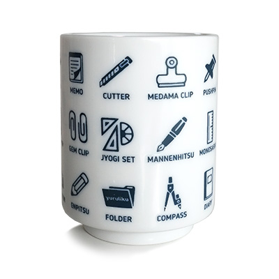 文具のアイコンを絵付けした「ペンスタンドにもなる湯のみ」です。 |